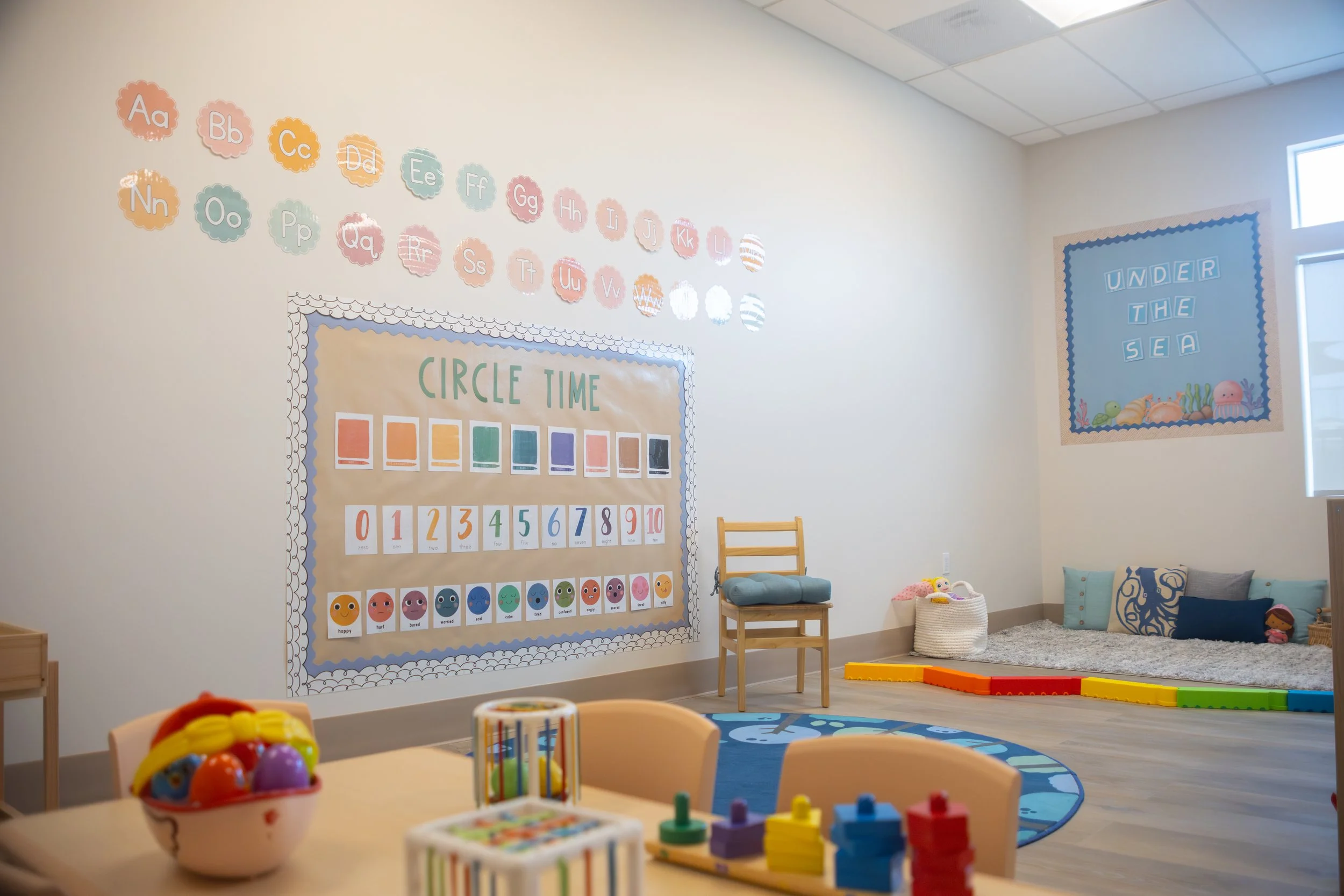 Throughout the day, the children are introduced to a variety of foundational concepts. These include social skills such as socialization, manners, sharing, and taking turns; self-help skills like feeding themselves, sitting appropriately during activities, and dressing; and becoming familiar with classroom materials such as books, crayons, markers, and glue. Language development is also encouraged through speaking, listening, and following simple directions.